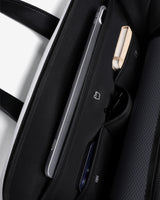 The briefcase offers three main compartments: a front quick-access pocket for frequently used items like phones, notebooks, pens, or keys; a large main compartment with padded protection for a 15-inch laptop; and organized inner dividers marked with icons for tablets, notebooks, chargers, and wallets. A rear luggage strap ensures secure attachment to suitcases, making it an ideal companion for business trips and daily commutes.