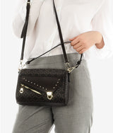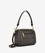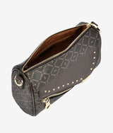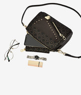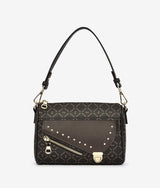 Small rectangular handbag with saddle bag inspired elements, color blocking with under toning material helps turn down the business of monogram pattern. Round metal stud applied adds punk vibe combining with unconventional press lock bringing in contemporary breath. One main large compartment for all fit in one maximizes storage area.