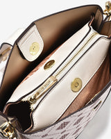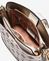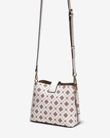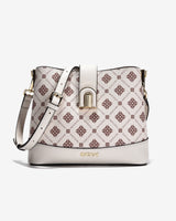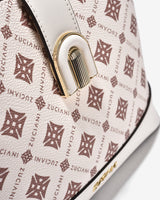 Adorned with Zuciani’s exclusive monogram pattern printed evenly across beige-toned PVC leather, it evokes the image of sunlight filtering through vintage shutters. The rounded gold-tone metal clasp adds a nostalgic glint, serving as a quiet focal point.