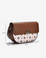 A sleek design featuring a distinctly divided body: the upper section crafted from smooth, warm brown leather, and the lower half adorned with a neatly repeated pattern—evoking sunlight streaming through vintage windowpanes.