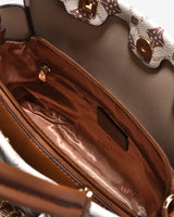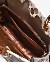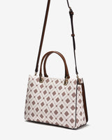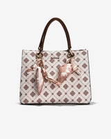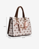 This bag features a compact, structured silhouette that conveys stability and maturity at first glance. Brand emblems appear like quiet imprints—consistent yet never monotonous. The gently curved handles in warm brown offer visual balance, seamlessly connecting the body of the bag with the elegant gold-tone metal details.