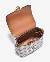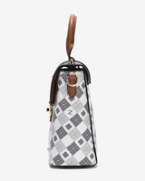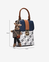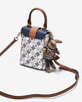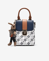 The Zuciani Mono La Fleur N09 Box-Style Crossbody Bag features a modern, compact square silhouette highlighted by a luxurious monogram pattern. The contrasting color-blocked flap adds a refined focal point, complemented by a sturdy metal clasp that enhances both aesthetics and structure. A distinctive bear-shaped charm brings a playful, youthful touch to the design. The rectangular interior is efficiently organized to accommodate essentials such as a smartphone, lipstick, and wallet. With an adjustable, versatile strap, the bag is well suited for city strolls, weekend coffee dates, or as a stylish accent for relaxed outings.