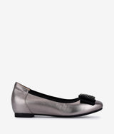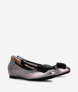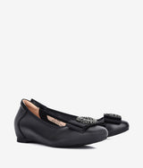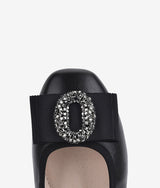 This classic pump detailing elegant ribbon bow and mysterious black rhinestone buckle deliver eye-catching shine to every step. Full leather upper and linings offer softness in feel while maintain graceful attraction. The unique featuring hidden heels and solid rubber outsole guarantees safety and versatility under any circumstances.