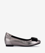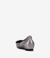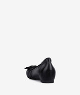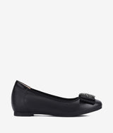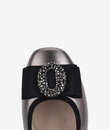 This classic pump detailing elegant ribbon bow and mysterious black rhinestone buckle deliver eye-catching shine to every step. Full leather upper and linings offer softness in feel while maintain graceful attraction. The unique featuring hidden heels and solid rubber outsole guarantees safety and versatility under any circumstances.