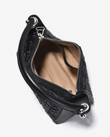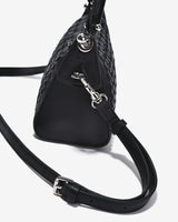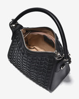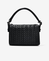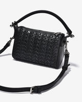 Inspired by traditional weaving techniques, this all-black handbag stands out with its unique herringbone-patterned surface. The boxy, compact form offers a perfect balance between structure and softness. A thick handle, attached to the body with round metal rings, ensures comfortable handling and easy movement. The deep black hue enhances the overall design with a modern, bold aesthetic—elegant yet unmistakably feminine.