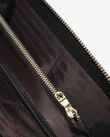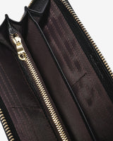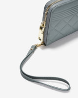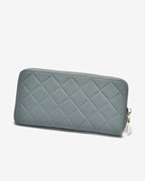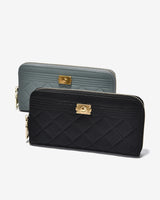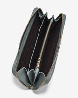 This long wallet features an elegant design accented by a striking metallic clasp, adding a modern touch. The softly rounded corners and concealed zip-around closure provide both security for the inner compartments and easy pairing with various styles.