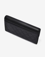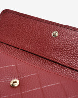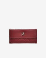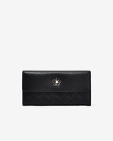 This premium long leather wallet features an elegant flap design, highlighted by a luxurious metal flower detail adorned with sparkling stones. The soft textured leather surface is complemented by subtle quilting, adding a refined touch. With multiple spacious compartments, it offers a stylish and organized way to store documents, cards, and cash.
